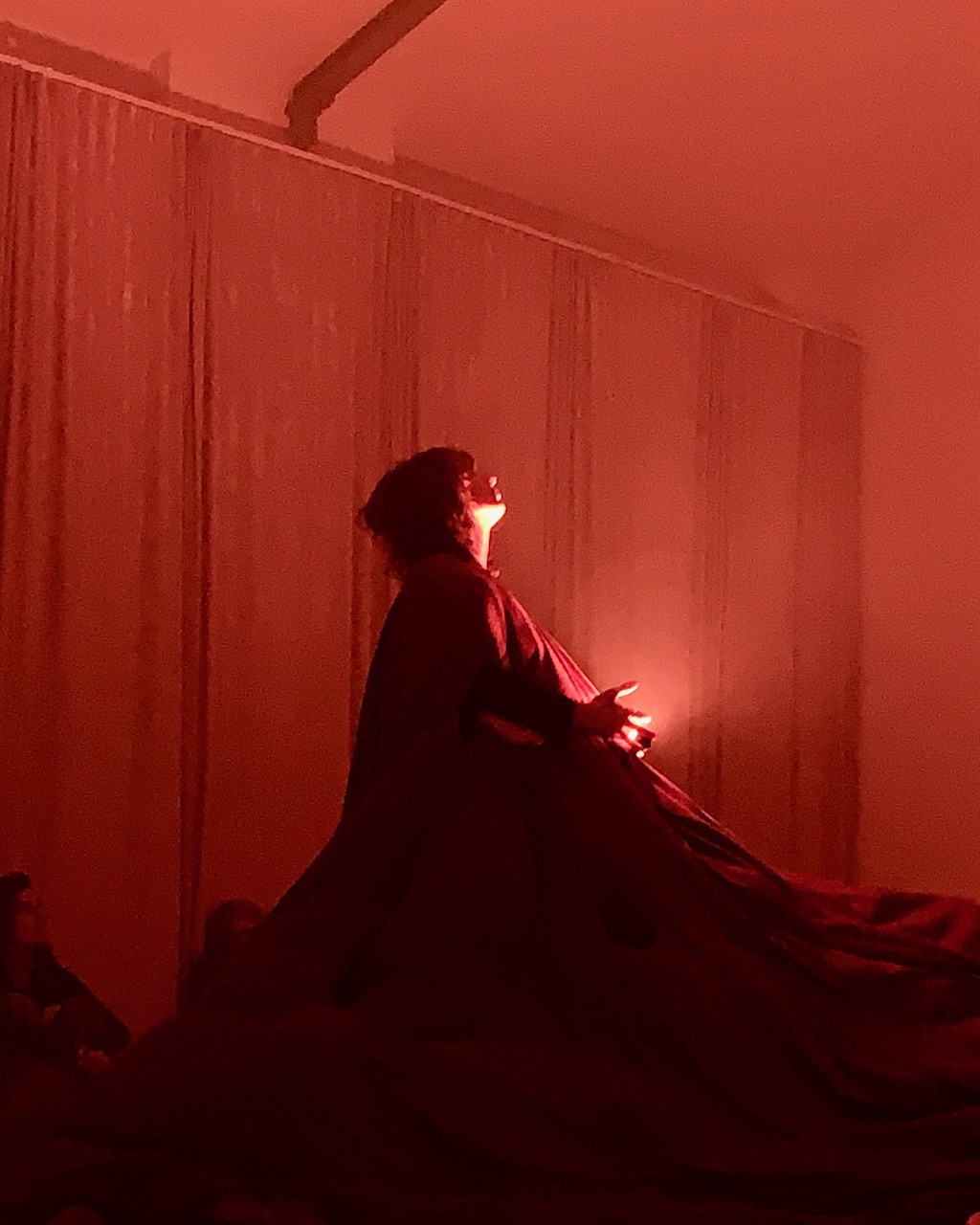 Rozi Mákó’s slow, mysterious soundscape set the tone for the opening, an initiation into darkness as a site of renewal. As guests signed a symbolic contract and tasted the bitterness of licorice, her deep, immersive sounds guided them into a dim space where light, fog, and a moving textile ‘ground’ appeared. The performance created a layered sensory environment, where sound, light, and movement merged into an enigmatic presence. Rozi Mákó is a Hungarian composer & musician.