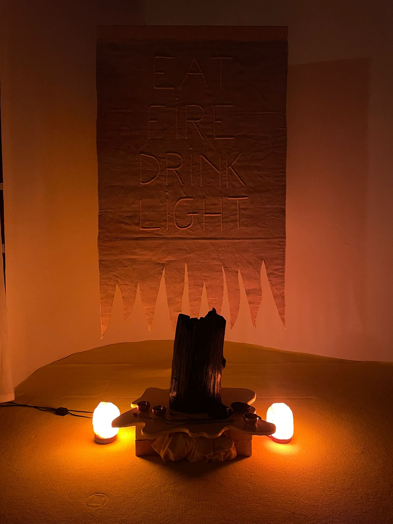 At the opening, Francesca emerged from beneath the textile ‘ground’ carrying an altar piece, which she placed on the floor as part of a gradual, performative process, burning dragon’s blood in the act. She also unveiled a flag inscribed with “eat fire, drink light”, marking a poetic extension of the work into the space.