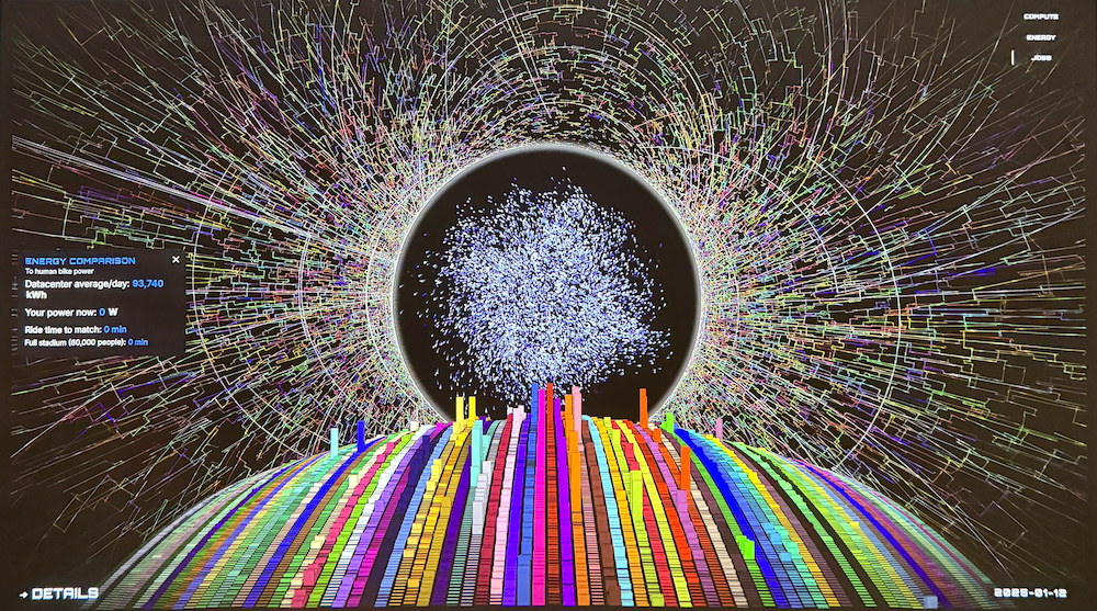 The challenge: translate supercomputer activity for public audiences without using dashboard language, without reducing computation to spectacle. The result sits between art and explanation. It invites contemplation rather than demanding comprehension.