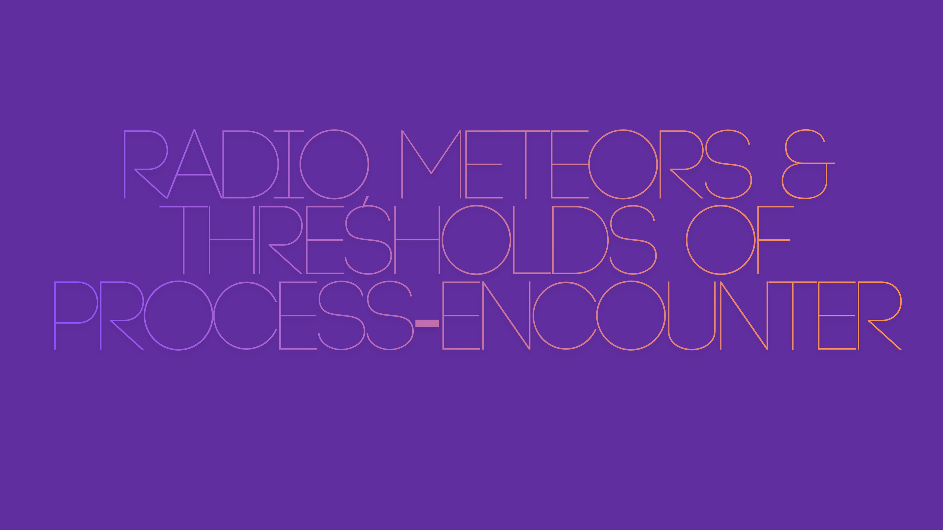 Unlike meteoroids (celestial bodies beyond the atmosphere of a planet or a moon), or meteorites (the remnant matter of some meteors that push through the atmosphere and come to land on a planet or a moon), meteors are not objects at all, but rather signifiers of process-encounter; their encounter with the atmospheric threshold of a planet or a moon results in a process of material change at great velocity. An electromagnetic signifier of a planetary threshold, we have much to learn from meteors.